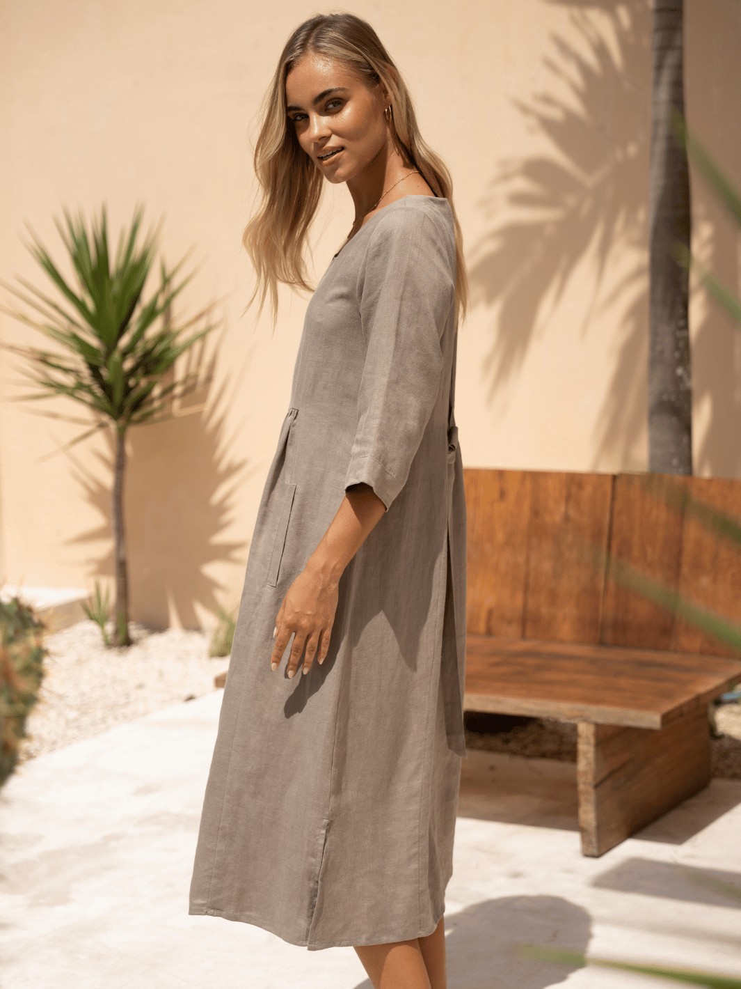 Made for days when ease and style go hand in hand, the Frankie Dress is crafted from breathable French linen in a durable twill weave. Designed to feel soft yet structured, it flatters gently with adjustable ties at the back and thoughtful sleeve coverage for all-day confidence.
